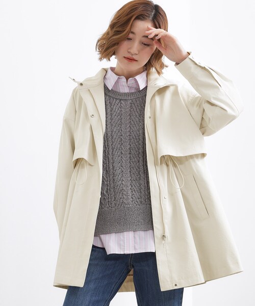 立体シルエットで、さっと羽織るだけでサマになる一着 【デザイン】 スタンドネックデザインがクリーンで洗練された印象のテントラインコートです。 高めのウエスト位置に配したドローストリングを絞ることで、シルエットにメリハリが生まれ、自然なスタイルアップが叶います。 前後にヨークを施し、立体感のあるデザインに仕上げています。 後ろヨークにはボックスプリーツを入れることで、動きに合わせて表情が出る後ろ姿も印象的。 金属ファスナーとドットボタンをアクセントに、シンプルながらも程よくエッジを効かせています。 羽織るだけでバランスが決まり、デイリーからきれいめまで幅広く活躍するコートです。 【素材】 ほどよいハリ感のある素材を使用し、テントラインのシルエットをきれいにキープ。 軽やかな着心地で、季節の変わり目にも取り入れやすい素材感です。 ややシボ感のあるナチュラルな風合いも特徴です。 撥水機能付きなのも嬉しいポイント。 YKKファスナーを使用しています。 【スタイリング】 ワイドパンツやスカートと合わせて、リラックス感のある大人カジュアルに。 ドロストを絞れば、細身ボトムとも好相性で、きれいめなスタイリングにも対応します。 シルエットアレンジを楽しみながら、幅広いコーディネートに活躍します。 【仕様】 ・ポケット数:前×2 ・裏地あり ※照明の関係により、実際よりも色味が違って見える場合があります。また、パソコン・スマートフォンなどの環境により、若干製品と画像のカラーが異なる場合もございます。 【26SS】 モデル情報:身長166cm B80 W59 H86 着用サイズ:02(M) 店舗へのお問い合わせ商品番号:768-45013 ●製品寸法: 01(S):着丈72cm B115cm 裄丈77cm 02(M):着丈74cm B118cm 裄丈78cm 03(L):着丈76cm B121cm 裄丈80cm 04(LL):着丈78cm B124cm 裄丈81cm 05(3L):着丈79cm B127cm 裄丈82cm 備考:重量:約675g(サンプルサイズ)