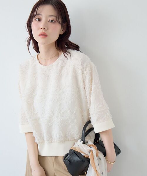《WEB限定アイテム》 風合いのあるジャガード素材を使用した一枚で存在感のあるブラウス。 さらっと取り入れるだけで華やかに。 袖口と裾口にリブ使いのアクセントをプラス。 きれいめスカートと合わせたONスタイルから、デニムでカジュアルまで幅広くコーデが楽しめます。