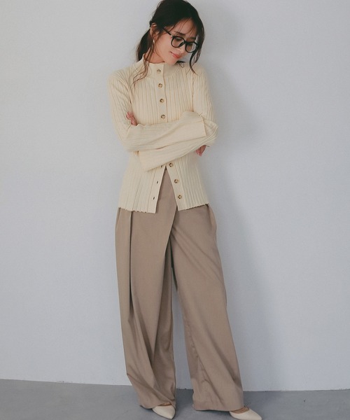 微光沢感のあるきれいめなツイル生地を使用した、ラップパンツ風デザインのスラックス。 アシンメトリーなフロントデザインが、程よくトレンド感を演出し、ベーシックなスラックスに物足りなさを感じている方におすすめの一本です。タックをしっかり入れることで、お腹まわりを自然にカバー。 立体感のあるフォルムが生まれ、シンプルなトップスを合わせるだけでもスタイリングを格上げしてくれます。ウエストはフロントがフラット、後ろはゴム仕様で、見た目のきちんと感と快適な穿き心地を両立。 フロントにはファスナーとフックを備え、着脱もスムーズです。 やや太めに設定したウエスト帯で、トップスをインした際のスタイルアップ効果も◎。ラップデザインならではの表情が、コーディネートに悩まずとも存在感のある着こなしを叶えます。 きれいめにもカジュアルにも振れるデザインで、オンオフ問わず活躍。 大人のワードローブに取り入れたい、シルエットにこだわったラップパンツです。 _________ 透け感:なし 裏地:なし 厚さ:やや薄め 伸縮性:なし お手入れ方法:クリーニング推奨 _________ 【ATTENTION】 商品写真はできる限り現品を再現するように心がけていますが、ご利用のモニターにより差異が生じます。サイズや重さなどに多少の個体差が生じる場合がございます。製品の仕様およびデザインは改善等のため、予告なく変更する場合がございます。