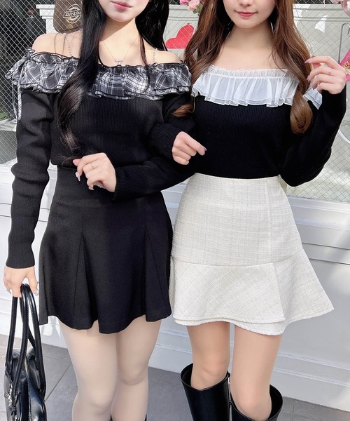 【ラインストーンのストラップとボリュームたっぷりのフリルが目を惹く♡オフショルニットトップス】 ▼Design デコルテ部分にたっぷりとあしらったフリルが存在感抜群のオフショルニット。 コンパクトなニット部分とボリューミーなフリルの組み合わせが メリハリのあるシルエットを演出してくれます。 肩紐はラインストーンチェーンになっているので 上品な印象を与えてくれます。 サイドのリボンがアクセントになりフェミニンさを演出してくれるので 着るだけでこなれ感あふれる最強トップス♡ ▼Styling ミニスカートを合わせてガーリーなスタイリングに♪ タイトスカートやロングスカートを合わせれば フェミニンな大人かわいいコーデになります。 ・ラインストーンチェーンストラップ取り外し可 【以下オフホワイト/オフホワイト参考。カラーにより多少の誤差あり】 ・透け感:やや透ける ・伸縮性:あり ・生地の厚さ:普通 ・裏地:なし ・ニット製品のため生地に伸縮性があり、サイズに若干の誤差が生じる場合がございます。予めご了承くださいませ。 ▼Recommend ・オフショル ・ニット ・フリル ・肩紐付き ・フェミニン ・ガーリー