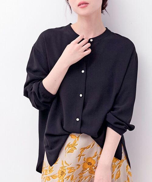 今年NO.1ヒットの大人気のブラウスの長袖がアップデートして登場!●ポイント今季は袖口にゴムを通し、袖丈を調節可能にしました。落ち感とドライ感があり、快適な着心地のストレッチジョーゼット素材を使用。フロントボタンのとめ方で、2通りの着こなしが楽しめる2wayデザインが人気のポイント。1.ストレートにボタンを留めたベーシックスタイル2.一番下のホールを前立て裏側のボタンに留め、フロントイン風のスタイル●おすすめコーデシンプルなシャツデザインですが、ゆったりとしたシルエットと落ち感のある素材で、カッチリせず柔らかい印象で着て頂けます。バックスタイルにはギャザーをあしらい、シルエットにニュアンスをプラス。ロングシーズン活躍する1枚です。※Dグレー、ブラックは《WEB限定カラー》となります。※手洗い可能