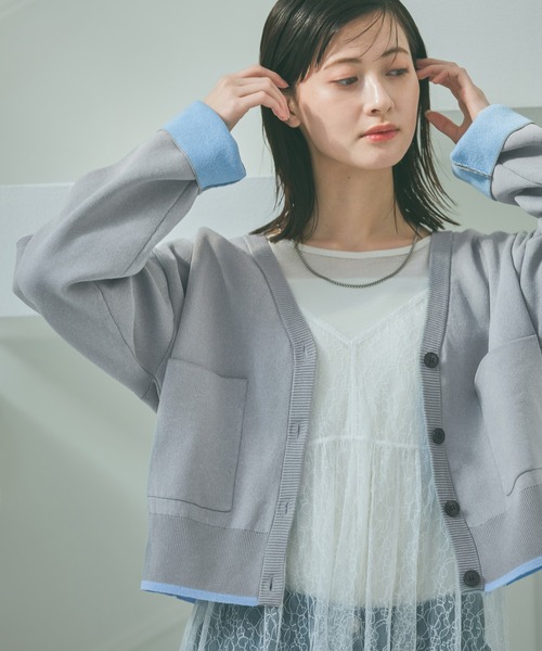 裏面にカラー配色をデザインしたカーディガン。ジャストの着丈でスタイリングもしやすく、さっと羽織るのに使いやすい万能アイテムです。ドロップショルダーにゆとりのある身幅でリラックス感のあるシルエットもポイント。【素材】ふっくらとしていて軽い、独特の風合いを持つポリエステル混素材。柔らかく肌触りも良い1枚です。【スタイリング】合わせるアイテムを選ばずスタイリングできるアイテムです。カーディガンとしてはもちろんプルオーバー風の着こなしもおすすめ。