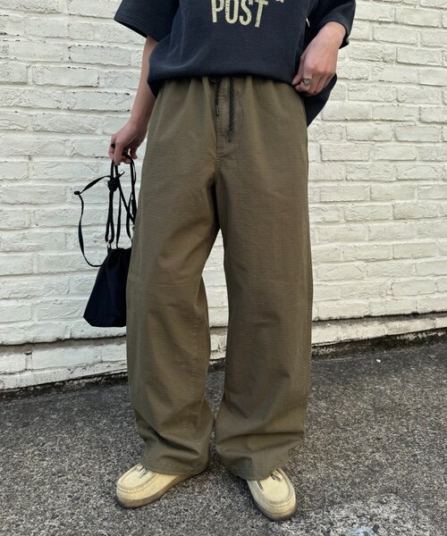 ウエストゴムでらくちん&丈夫なリップストップ素材! シンプル着やすい定番イージーパンツ◎ ■デザイン アウトドアギアに最適!丈夫で軽やかな生地を使用したミリタリーパンツ。 ほつれや破れに強く、長く愛用できるのが嬉しいリップストップ素材にしました◎ また、綿100%でナチュラルな風合いに加え着心地も快適。シーズン問わず活躍します。 シルエットはストレートをベースに、裾のドローコードで気分によって変えることが可能。 程よくゆとりを持たせたワイドすぎず細すぎないバランスがスタイリングの汎用性をUP! ミリタリー素材ながらラフになりすぎず、トップスを選ばず着回しやすい一本です。 ゴム仕様のウエストのリラックスした穿き心地と、 腰・後ろのサイドポケットなどの実用性はデイリー使いに最適。 着回しやすいブラックとカーキの2色展開にしました! ■スタイリング シンプルなTシャツやスウェットと合わせるだけで、ラフ過ぎないカジュアルスタイルが完成。 シャツや薄手ニットを合わせれば、ミリタリー感を抑えた大人っぽい着こなしにも。 足元はスニーカーでラフ・レザーシューズであえてワークテイストなど気分やスタイルで決めてOK! ■動画 model 158cm:Mサイズ着用 model 170cm:Lサイズ着用 ■お手入れ方法 洗濯:液温は30 ℃を限度とし、洗濯機で非常に弱い洗濯ができる アイロン:底面温度160 ℃を限度としてアイロン仕上げができる タンブル乾燥:不可 ・・・・・・・・・・・・・・・・・・・・・・ 透け感:なし 裏地:なし 伸縮性:なし 光沢感:なし 生地の厚さ:普通 ・・・・・・・・・・・・・・・・・・・・・・ ▼気になる商品をお気に入り登録 ハートをクリックして《お気に入り登録》がオススメです! 入荷情報や、クーポン情報が通知されるようになります。 ※画像の商品はサンプルを使用しております。実際の商品と若干の仕様が変更になる場合がございますので、予めご了承の上ご注文くださいますようお願いいたします ※屋外の光や照明の当たり具合で、実際の商品の色味とカラー別画像の色味に若干の違いが発生する場合がございます。詳細画像と併せてご確認の上、ご注文いただきますようお願い致します。 ※独自のタイムセールなどの施策により、実店舗と価格差が発生する場合がございます。 ※実際の店舗在庫につきましては、各店舗に直接お問い合わせください。