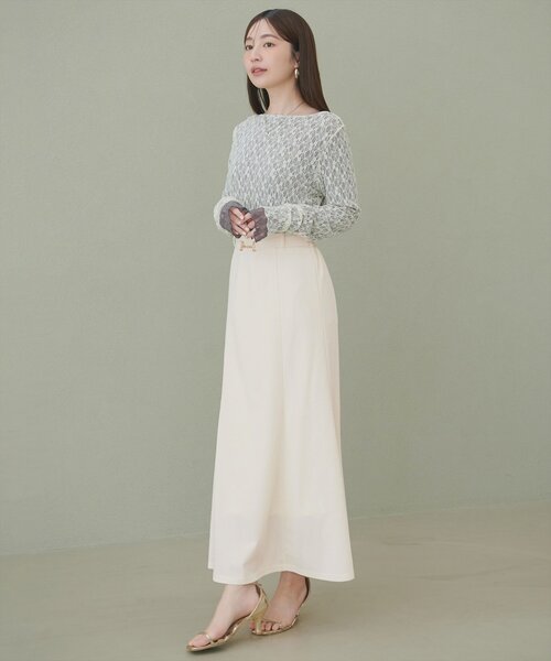 【2026SS natural couture】カットジョーゼットビットスカート■Design ウエストにあしらわれたビット金具がポイントのスカート。クラシカルな雰囲気を添え、シンプルなスカートに華やかさをプラスします。トップスをインして、ビットを見せるスタイリングがおすすめです。すっきりとしたIラインシルエットと、裾にかけて緩やかに広がるフレアが、女性らしい上品な印象を与えてくれます。■Stylingシンプルなデザインなので、どんなトップスとも相性抜群です。ブラウスと合わせてオフィススタイルに、ニットと合わせてカジュアルスタイルに、Tシャツと合わせてリラックススタイルにと、様々な表情を楽しめます。足元は、パンプスやブーツ、サンダルなど、合わせるアイテムによって雰囲気を変えられます。■Fabric さらりとした肌触りで、軽やかな着心地。※サイズ補足 裾周り:199㎝===================お手入れ方法:手洗い伸縮性:ウエストゴム部分あり裏地:オフホワイトのみあり透け感:なし光沢感:なしポケット:なし生地感 :さらりとした生地感===================※着用、お取り扱いの際は、商品に付いている品質表示とアテンションタグを必ずご確認ください。【お気に入り登録でお得な情報がいっぱい】・「商品のお気に入り登録」で再入荷通知や、ラスト1点の通知、セール通知をいち早く受け取ることができます。・「ブランドのお気に入り登録」で新商品や再入荷など、お得な情報を受け取ることができます!※店舗の入荷時期は商品によって異なります。店頭の在庫状況につきましては各店舗にてお問い合わせください。※撮影時の光の関係で、画面上の画像と実際のお色とでは若干の色差が生じる可能性がございます。また、ご覧いただいているモニター画面や、お使いのブラウザによっても、お色の違いがございますことをあらかじめご了承くださいませ。202601232026SS_natu26SS