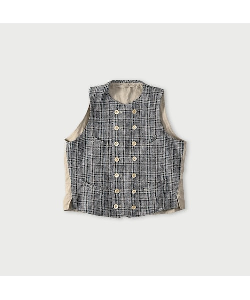 節もかけらも織り込んだツイード綿と麻を紡いでつくる糸は、節や植物のかけらが混ざったり、ところどころ太さが違ったりして、表情がかわいいのですが織り上げるには時間と技術が必要です。ざっくりドライで着心地のよい着るほどに味わい深くなるツイードができました。くたっとしたリネンが体に沿って、美しいシルエットをつくります。裏地のストライプがお茶目な、ダブル仕立てのクラシックなベストです。