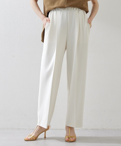 【2026SS】スタイルやシーンを選ばない、きれいめイージーパンツ■シンプルなデザインが嬉しいタックパンツ。■軽くしなやかなストレッチ性のある生地が着心地抜群の一枚。■さらにジョーゼット調の表情感をプラスし、ジャージーでありながら布帛のような見え方が特徴。■フロントタックが気になる腰周りのラインをカバーし、程よい太さのテーパードシルエットですっきり見えも◎。■センタープレス加工によって美脚効果も抜群で、イージーな着心地ながらもきれい見えするのもポイント。■ジャケットやヒール合わせでオフィススタイルにも、Tシャツやスニーカーと合わせてカジュアルにも着こなせる万能パンツ。【COLOR】イエロー:スタイリングに明るさをプラスする、優しいレモンイエロー。オフホワイト:洗練された印象を与えるクリーンなオフホワイト。ブラック:オンオフ問わずに着回しやすいベーシックなブラック。【MATERIAL】軽さと膨らみ、しなやかなストレッチ性を持ち合わせたジャージー素材。【STAFF COMMENT】■身長156cm|普段サイズ M~L|着用サイズ Fウエストがゴム、ストレッチ性もあり、履いていて楽な綺麗めパンツ。着こなしの幅が広く、ジャケット、シャツ、ニットなど楽しめます。とろみがあるので上品。■身長166cm|普段サイズ M~L|着用サイズ Fウエストゴムがとても楽でジャージのような穿き心地です。ヒールを合わせて私には若干丈が短く感じましたがスニーカーだと問題ないと思います。落ち感と光沢感が上品で、ビジネスシーンにも着回せるきちんと感があります。----------------------------------------------------洗濯方法:手洗い可透け感:ややあり(オフホワイト)裏地:なし伸縮性:あり光沢感:なし----------------------------------------------------【注意事項】・画像の商品はサンプルです。実際の商品と仕様、加工が若干異なる場合があります。また 、パソコンやスマートフォンのモニター環境などにより、色味が違って見える場合があります。・店頭及び屋外での撮影画像は、光の当たり具合で色味が違って見える場合があります。商品の色味は、スタジオ撮影の画像をご参照ください。・入荷状況により、お届け予定が前後する場合があります。・お客様への発送が店頭販売より遅れる場合があります。・追加生産商品は、一部の店舗、通販で販売中の場合があります。予めご了承下さい。【気になるアイテムは、「お気に入り」登録を】ハートマークをクリックしておくことで、スムーズにお買い物が楽しめます。・ラスト一点のお知らせ・再入荷のお知らせ・SALEのご案内