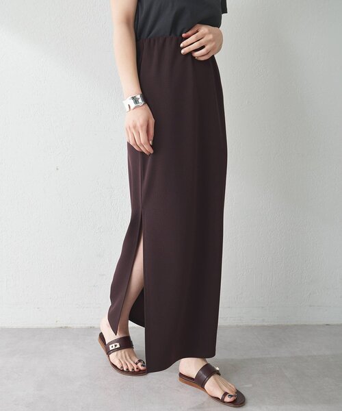 【2026SS】どんなシーンにも着回しの効くサイドスリットスカート■ジャージー素材を使用したミニマルなIラインスカート。■軽くしなやかなストレッチ性のある生地が着心地抜群の一枚。■さらにジョーゼット調の表情感をプラスし、ジャージーでありながら布帛のような見え方が特徴。■すとんと落ちるロング丈ですっきりと見せ、脇のスリットで抜け感と足捌きの良さをプラス。■きれいめからカジュアルまでスタイルを選ばず、オンオフ問わずに着回しの効くアイテム。【COLOR】イエロー:スタイリングに明るさをプラスする、優しいレモンイエロー。ブラウン:上品な印象に仕上げてくれる、赤みを含んだブラウン。ブラック:オンオフ問わずに着回しやすいベーシックなブラック。【MATERIAL】軽さと膨らみ、しなやかなストレッチ性を持ち合わせたジャージー素材。【PICK UP REVIEW】※自社サイトにいただいたお客様のレビューです■36 size|身長155cm足捌きがよく、ウエストがゴムで余裕があり、とにかく履きやすいです。スリットが入っていますが、上品さが感じられ、脚が綺麗に見えます。シルエットも綺麗で、カジュアルでも、オフィス使いでも使えると思います。購入して満足です。■36 size|身長160cm柔らかくてよく伸び履きやすいです。スリットが大胆ですが横なのでさりげなくて良いと思います。160センチで36サイズで足首隠れるくらいなので比較的長めです。■38 size|身長163cmよく伸びて自転車もガンガン漕げるし、洗っても乾きやすい素材でシワにもならないし、色味が絶妙で買って良かったです~【STAFF COMMENT】■身長156cm|普段サイズ M~L|着用サイズ Fストレッチ性があり、シワになりにくいタイトスカート。スリットがサイドに入ってますので、足捌きも良いです。ウエストがゴムで楽。普段使いから、お食事会、旅行など、幅広くお使いいただけます。活躍間違いなしです。■身長162cm|普段サイズ S~M|着用サイズ F優しいカラーのイエロー。季節を一気に進めるオシャレなカラーです。ウエストはゴム仕様で穿きやすく、ヒップの高い位置くらいまではフィットします。シワになりずらいのも好ポイント。スリットも入っているので涼しく過ごせます。----------------------------------------------------洗濯方法:手洗い可透け感:ややあり裏地:なし伸縮性:あり光沢感:なし----------------------------------------------------【注意事項】・画像の商品はサンプルです。実際の商品と仕様、加工が若干異なる場合があります。また 、パソコンやスマートフォンのモニター環境などにより、色味が違って見える場合があります。・店頭及び屋外での撮影画像は、光の当たり具合で色味が違って見える場合があります。商品の色味は、スタジオ撮影の画像をご参照ください。・入荷状況により、お届け予定が前後する場合があります。・お客様への発送が店頭販売より遅れる場合があります。・追加生産商品は、一部の店舗、通販で販売中の場合があります。予めご了承下さい。【気になるアイテムは、「お気に入り」登録を】ハートマークをクリックしておくことで、スムーズにお買い物が楽しめます。・ラスト一点のお知らせ・再入荷のお知らせ・SALEのご案内