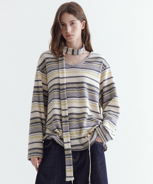 "国内でchucllaだけが、正規取扱いするコンテンポラリーブランド" 落ち感のあるしなやかなニット素材を使用したトップス。 カラーブロックストライプが目を引く、レトロなムードと洗練された印象を兼ね備えたデザイン。 首元には同柄のニットタイ付きで、巻き方次第で印象を変えられます。 程よく揺れるシルエットがリラックス感を演出しつつ、スタイリング全体をスマートに仕上げます。 着るだけでこなれた印象になり、スタイリングのアクセントとしても活躍する落ち感ニットトップスです。 【Fano Studios】 レトロ・シック・フレンチカジュアルをテーマに トレンドを取り入れながらも女性らしさを兼ね備え、 洗練されたデザインを発信するブランド。 取扱注意事項 ※サイズは、測定方法と測定者によって多少の誤差がありますのでご了承下さいませ。 また体型によって、サイズ感に個人差がございます。(平置き採寸) ※商品によってはシワがつきやすく、畳みジワや折りジワなどが強く出る場合がございます。 その際は加湿した風呂場に数時間干すか、スチームアイロンでのお手入れをお勧めしております。 ※生地の素材上、においが気になる場合がございます。 その際は陰干しして頂くと、ほとんど感じにくくなります。 ※レース等の繊細な素材を使用している場合には、お取り扱いにご注意下さい。 ※デニムを使用した製品は、インディゴ染めをしています。汗や摩擦により移染しやすいので、白色、淡色の組み合わせや重ね着はお避け下さい。 ※ニット素材を使用した製品は、重みで伸びやすくなりますのでハンガーでの保管はお控えください。 ※お洗濯の際には、品質表示の指示に従ってください。必要であれば専門店にご相談ください。 家庭でご洗濯できる商品に関しては、洗濯専用ネットをご使用の上、個別での洗濯をお勧めいたします。 お色物は、色移りする可能性がございます。 ※着用画像は撮影状況や光によって、多少異なる場合がございますので、置き画像をご確認下さい。 ※ カーディガンを含むニットやセータ類は、各箇所の縫い目にほつれているような糸が見えることもございます。 仕上げの特徴上、縫留めの箇所となりますためくれぐれも引っ張らないようお願い申し上げます。 引っ張ることにより縫い留めがほぐれる恐れがございます。 ※2023年7月1日より、環境に配慮した取り組みの一環として、紙のアテンションタグを廃止しております。