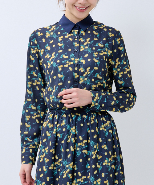 カラフルな色使いが華やかなムードを演出するチェリープリントブラウス。襟と袖の切り替えに無地の生地を使用することで、さりげないアクセントになります。チェリープリントは可愛くなりすぎない上品さのある写実的なタッチがポイント。同シリーズのスカートと一緒に着用することでワンピース見えにもなり、単品使いとして無地のボトムスと合わせるコーディネートもおすすめです。 ・透け感なし ・ストレッチなし ・カラー展開はライトブルー、ネイビー ・サイズ展開は1(M)9号・2(L)11号・3(2L)13号