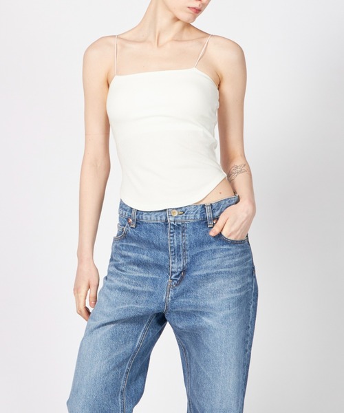 繊細な極細ストラップが目を惹くカップ付きキャミソール。身体のラインに心地よく馴染む、キックバックの良い素材を採用。優れたフィット感がありながら、締め付け感の少ない快適な着心地を実現しました。胸元を直線的にカバーするベア型デザインは、露出を抑えてヘルシーな印象に。1枚での着用はもちろん、アメリカンスリーブのインナーとしてストラップを覗かせるレイヤードも旬な着こなしです。カップは取り外し可能なため、お好みのフィット感やシーンに合わせてお使いいただけます。