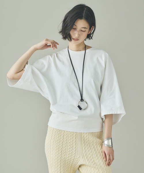 WEB先行予約受付中 2026 SPRING&SUMMER COLLECTION 計算されたシルエットで魅せる大人のドルマンTシャツ ■デザイン ・身頃は程よくゆったりとさせ、体のラインを拾わない計算されたドルマンスリーブ。 ・大きく見えすぎない絶妙なシルエットを追求。 ・裾をあえてやや狭めに設定することで、ニュアンスのあるシルエットに。 ・普通のTシャツよりもさりげなく女性らしさを演出できる万能な一着。 ・ボリュームのあるボトムスとも相性良くカジュアルダウンが可能。 ■素材 / お手入れ方法 ・インドの超長綿をブレンドした希少性の高い糸を採用。 ・細番手の糸をハイゲージに編み立てることで、ナチュラルさと上質さを両立。 ・滑らかな肌触りが特徴の贅沢な天竺素材。 ・洗濯後の毛羽立ちを抑えており、優れた洗濯耐久性を実現。 【Curensology(カレンソロジー)】 旅とは、非日常と日常の間を行ったり来たりしながら、その土地の空気や風景、文化、歴史、そして出会いを、五感のすべてを使って受け止めること。「カレンソロジー(Curensology)」は、そんな旅をイメージした、知的でエレガントな女性のためのワードローブとテキスタイルを提案。バカンスや出張に持っていきたい機能的なアイテムをはじめ、日々の暮らしをアップデートする新しいデザイン、着心地の良いエッセンシャルなものなどを展開しています。 ※サンプルにて撮影をしておりますので、実際の商品とは仕様や加工・サイズ等が若干異なる場合がございます。 ※屋外の光や照明の当たり具合で、実物と色味が異なって見える場合がございます。詳細画像の色味をご確認ください。 なお、商品の色や質感を出来るだけ忠実に再現するよう心掛けておりますが、パソコンなどの環境により、実物と若干異なる場合がございます。 ▼商品のお気に入り登録をおすすめします▼ ♡をクリック!完売カラーの再入荷や、ラスト1点の通知、セールの際の通知を受ける事ができます。ブランドのお気に入り登録もご一緒にお願い致します。