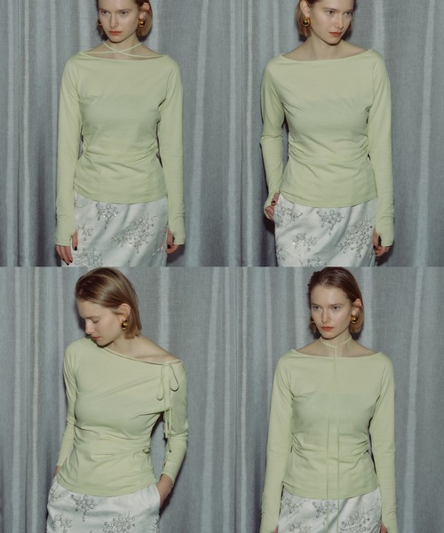 ⚪︎チョーカーリボンがポイントのカットソー⚪︎■Point・広めのネックラインとリボンデザインが目を惹く、デザイン性の高いロングスリーブトップス。リボンは取り外し可能で、チョーカーのように首に巻いたり、結ぶ位置を変えたりと一枚で雰囲気を変えることができます。・ウエスト位置に入ったギャザーが身体のラインを美しく見せ、1枚でスタイリングが決まる主役アイテムです。柔らかく伸縮性のあるコットン素材を使用しており、程よくフィットしながらもストレスフリーな着心地。・デコルテをきれいに見せてくれるので女性らしさとモード感を兼ね備えた印象に仕上げています。シンプルなボトムと合わせるだけで、洗練されたスタイルが完成する一着です。・レイヤードにも着まわしやすい薄い素材のカットソーです。----------------------------透け感:ややあり伸縮性:ありお洗濯可能◎----------------------------■ColorBlack /Light green /Light blue※トルソーに着せた画像が本来の素材の色味に近しいものです。撮影の照明、自然光などの条件により色の感じ方が変わる場合がございますが写真後半のトルソー写真をぜひご覧ください。■SizeFreeチョーカーの長さ:170cmチョーカー巾:0.5cm■Materialコットン: 100%■Item Attention製品によっては染料の特性上、湿った状態や汗をかいた状態での長時間の放置や摩擦により、他のもの(特に白物)へ色移りする恐れがあります。ご着用時には十分ご注意下さい。■Attention※発売日時やお届け予定時期は変更となる場合がございます。あらかじめご了承下さいませ。※商品のお色味は、お使いのデバイスや撮影時の照明等により、実物と若干異なって見える場合がございます。また、撮影ではサンプルを使用しておりますため、実物の商品と若干サイズ感が異なる場合がございます。※お取り扱いにつきましては、品質表示とアテンションタグを必ずご確認下さいませ。❤︎お気に入り登録「商品のお気に入り登録」で、再入荷通知や、ラスト1点の通知を、「ブランドのお気に入り登録」では、新商品の入荷や、再入荷のご案内などのお得な情報を受け取ることができます。是非ご登録くださいませ!