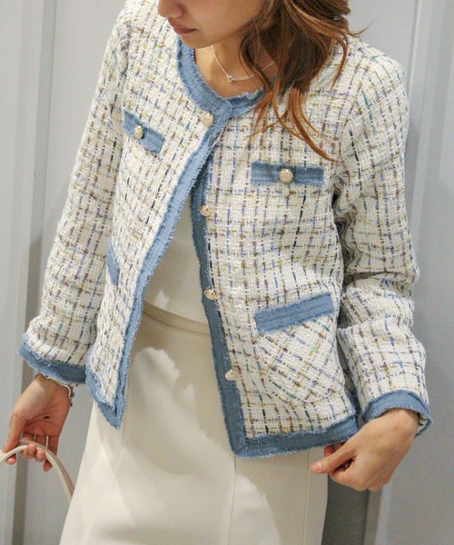 【SpRay デニムトリミツィードジャケット】上品ツイード、こなれデニムの欲張りデザイン! クラシックな雰囲気のツイードジャケットに、あえて切りっぱなし風のデニムトリミングを施した、遊び心のある一着。「ツイードはカッチリしすぎて苦手…」という方でも、デニムの抜け感があることで、いつものジーンズやTシャツの上にさらっと羽織るだけで、こなれた大人カジュアルが完成します。#ツイードジャケット#デニムジャケット#ノーカラージャケット#フリンジジャケット#デニムトリミング#大人カジュアル#韓国ファッション#スプレイ#spray【素材感】柔らかく肌触りの良い生地。※詳しいお手入れ方法は商品タグをご参照ください。◆伸縮性無し ◆透け感無し ◆裏地有り 【商品のお気に入り登録】完売カラーの再入荷通知やラスト1点の通知プライスダウンの通知も受け取ることができます。ぜひご登録ください◎【ブランドのお気に入り登録】新商品や再入荷など、いち早く情報を受け取ることが出来ます。※輸送時による、多少の汚れ・シワがある場合がございます。※撮影時のライティング、ご覧になっているモニター・PC環境により実際の商品と色味が異なって見える場合がございます。ご了承の上お買い求め下さい。※着用、お取り扱いの際は、商品に付いている品質表示とアテンションタグを必ずご確認ください。