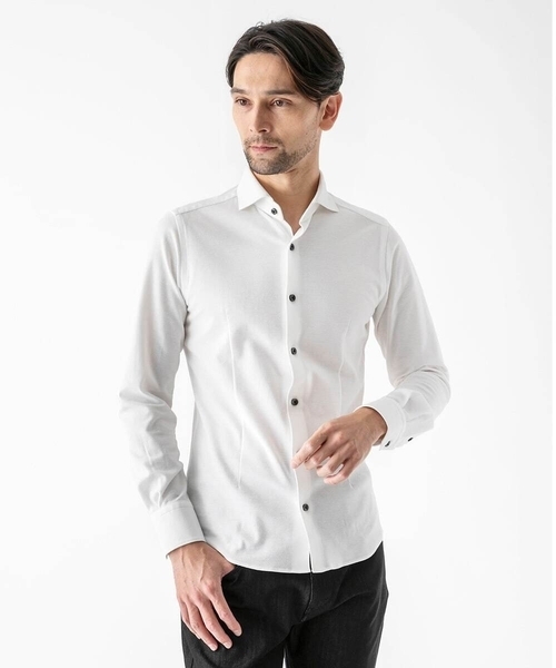 シャツ/ALBINI(アルビニ) 【デザイン】 ・定番の襟デザインながら、ホワイトカラー特有の透けを考慮し、あえてワンピースカラー仕様を避けた台襟設計を採用。 ・通常の台襟ながら、襟付けのパターンラインを丁寧に調整することで、首元に美しく沿う自然な立ち上がりを実現しています。 ・襟先は水平に近いラインを描くホリゾンタルカラー(カットアウェイ)で、スマートかつ上品な印象に。 ・シルエットは身体のラインを引き立てる計算されたパターンで構築され、適度なフィット感と快適性を両立。 ・通常通り着丈はやや短めに設定されており、タックアウトスタイルでも美しく決まります。 ・ビジネスから休日のカジュアルシーンまで幅広く活躍する、汎用性の高いベーシックシャツです。 【素材】 ・京都で生産された、世界最高峰のシャツ生地メーカーであるイタリア・アルビニ社の高級綿糸「コーコラン」とポリエステル糸を交編することで、吸水速乾性に優れた機能性素材“コーコラン×VERTICAL”として開発されたものです。 ・天然素材ならではの上質な風合いと、機能性素材ならではの扱いやすさを兼ね備えており、快適な着心地と上品な見た目を両立。 ・オックスフォードに似た表情を持つジャージ素材で、自然なストレッチ性とソフトな肌触りが魅力です。 ・高機能かつ高品質なファブリックです。 【コーディネート】 ・セットアップ合わせでビジネスカジュアル、カーディガンやニット合わせで上品なオフィススタイルに活躍。 ・カットソーをインナーに、デニムやスラックス合わせで大人の休日カジュアルにもおすすめです。 【お手入れ方法】 ・ご家庭で洗濯できます 【着用シーズン】 春:◎ 夏:○ 秋:◎ 冬:○ ------------------------ 透け感:なし※ホワイトはややあり 伸縮性:ややあり 光沢感:なし 生地の厚さ:やや薄め ------------------------ ※屋外での撮影は色味が多少異なる場合がございます。商品の色味は、スタジオ撮影の画像をご参照ください。 ※サンプルでの撮影となるため、実際にお届けする商品と仕様やサイズが異なる場合がございます。