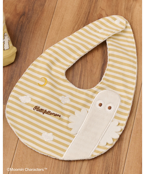 つけるだけで可愛らしいファッショナブルなスタイです。 ムーミンの耳やニョロニョロの手が立体になっているのがポイント。 カラシはニョロニョロ、ライトグリーンはムーミンのモチーフをほどこしました。 さらにロゴ・雲・月の刺しゅうで華やかさをプラス。 ボーダーはラトルとお揃い生地を使用しています。 首周りはスナップボタンで2段階に調節可能です。 防水シート入りでよだれなどが染み込みにくい機能も兼ね備えています。