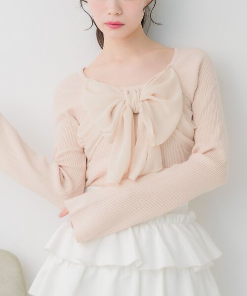 <大きなリボンが目を惹くガーリーニット>▼デザインデート場面や参戦コーデにピッタリなリボンニット!胸元にはシフォン素材の大きなリボンが華やかで、1枚でヒロインコーデに。袖口はふわっと広がるフレアスリーブで女性らしいシルエットに。首回りはすっきり空いているので、ネックレスやチョーカーと合わせても相性抜群です◎▼コーディネートフレアスカートやマーメイドスカートで女性らしいコーデがおすすめ!1枚では肌寒いシーズンは上からカーディガンやアウターを羽織っても◎------------------------------生地感:普通伸縮性:ある透け感:なし裏地:なし------------------------------▼ブランド紹介ems excite (エムズエキサイト)“more fun more cute”今をもっと楽しくもっと可愛くいたい女の子に向けたgirly cuteなブランド#リボンニット #デカリボン #ガーリー #ガーリーコーデ #リブニット #フェミニンコーデ #春コーデ▼注意事項※撮影環境やモニター環境によって実際の商品とお色味が 多少異なってみえる場合がございます。品番:EP641512B001 / 品名:BIGリボンドッキングNT