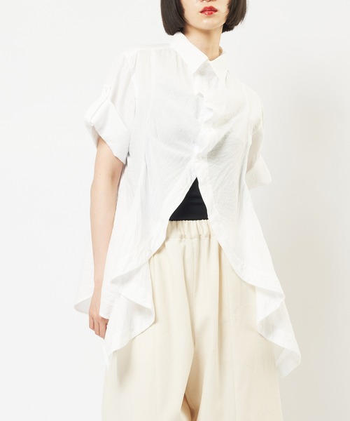 2026 SPRING&SUMMER COLLECTION ■design ・前身頃に大胆なドレープを施した、存在感のあるブラウス。 ・gommeではおなじみのシルエット。 ・デザイン性がありつつ、襟付きの仕様でコントラストのあるアイテム。 ・ガーゼ生地で透け感があり、柔らかい印象に。 ・タブ付きスリーブで、袖のシルエットに変化をつけられるデザインです。 ■fabric ・繊細な細番手で織り上げたダブルガーゼ。 ・絶妙な膨らみ感があり、肌触りの良いテキスタイル。 ■coordinate ・同素材のボトムを合わせてセットアップに。 ・ボリュームのあるボトムを合わせてカジュアルに着こなすのも◎ ‥‥‥‥‥‥‥‥‥‥‥‥‥‥‥‥ 厚さ:薄地 透け感:あり 伸縮性:なし 光沢感:なし ポケット:なし 裏地:なし ※詳しいお手入れ方法は商品タグをご参照ください。 ‥‥‥‥‥‥‥‥‥‥‥‥‥‥‥‥ 《お知らせ》 ・商品画像はご覧のモニター環境により、実物の色味と多少異なる場合がございます。予めご了承ください。 ・「商品のお気に入り登録」で再入荷・値下げ・在庫1点などの通知を受け取ることができます。 ・「ブランドのお気に入り登録」で新商品や再入荷など、お得な情報を受け取ることができます。 ※他のキャンペーンにより、期間中に価格が変動する場合があります。 ※セールは予告なく終了させて頂く場合もあります。