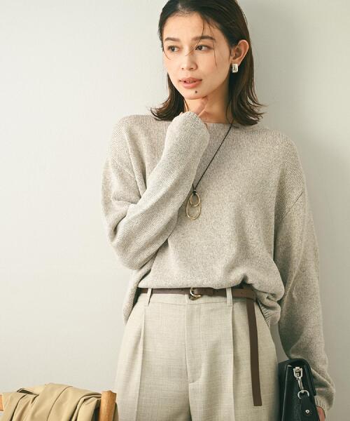 【デザイン】 イタリア糸ならではの良質な光沢感が魅力のニット。 糸の中心を空洞にしたリリヤーンを使用することで、表情豊かなざっくりした編地ながら軽やかな着心地を実現しました。 程よい抜け感があり、キレイめカジュアルなスタイルに好相性です。 今シーズン注目のショート丈でバランスよく着こなせます。 【素材感】 先染スパンレーヨン単糸と強い光沢と透明感のあるポリエステルを、中心が空洞のネットの様な形状に撚糸したリリアン糸。 程よい落ち感、上品な光沢感と適度なハリ感を持ち合わせたイタリア製のファンシーヤーン。 【着こなしポイント】 ショート丈で全体をすっきり見せ、ロングスカートやワイドパンツと好バランス。 袖と裾の細リブすっきりと見えがあらゆるボトムスに合わせやすく、シャツをレイヤードしたスタイルもおすすめです。 ※照明の関係により、実際よりも色味が違って見える場合があります。また、パソコン・スマートフォンなどの環境により、若干製品と画像のカラーが異なる場合もございます。 モデル情報:身長163cm B77 W56 H87 着用サイズ:02(M) 店舗へのお問い合わせ商品番号:153-15258 ●製品寸法: 00(XS):着丈47cm B97cm 袖丈49cm 肩幅41cm 02(M):着丈50cm B107cm 袖丈51cm 肩幅45cm 04(2LT):着丈54cm B113cm 袖丈52cm 肩幅48cm 44(3L):着丈53cm B121cm 袖丈50cm 肩幅50cm 48(5L):着丈53cm B129cm 袖丈50cm 肩幅54cm 備考: