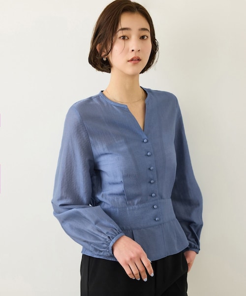 【デザイン・シルエット】 後ろウエスト部分にシャーリングを施し、程よくウエストラインを引き締めたタック入りペプラムシルエットが女性らしさを引き立てるデザインブラウス。 ふんわりと広がるシルエットながらも甘くなりすぎず、体型カバー効果も期待できます。 素材特有の上品な光沢感と程よいシアー感が、抜け感のある大人フェミニンな印象を演出します。 【おすすめのスタイリング】 オン・オフ問わず活躍する、1枚でコーディネートが完成する主役ブラウス。 タイトスカートやフレアスカートと合わせればきれいめ・オフィススタイルに、 デニムパンツやワイドパンツと合わせれば程よくカジュアルダウンした着こなしも楽しめます。 シーズンを通して着回し力の高いアイテムです。 【素材】 シアーカールマイヤー素材を使用。 ソフトで軽やかな風合いと、繊細でなめらかなタッチが特徴です。肌離れが良く、快適な着心地を叶えます。 ---------------------------- 透け感:あり 裏地:なし 伸縮性:なし 光沢感:あり 生地の厚さ:薄手 ポケット:なし 開き方:ボタン 洗濯:手洗い可能 ---------------------------- 【モデル情報】 モデル身長:171cm 着用サイズ:38 ※画像の商品はサンプルです。実際の商品と仕様、加工、サイズが異なる場合がございます。 ※撮影場所やライティング、お使いのモニター環境によって色の見え方が異なる場合がございます。 ※商品のカラーは画像の色味をご参照ください。動画は仕様説明のため、色味が実物と異なる場合がございます。
