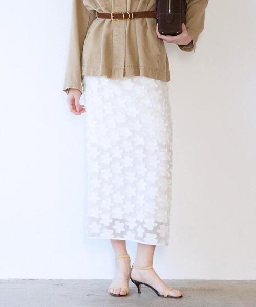 ≪デザインポイント≫ 華やかで目を引くツッキリジャガードを使用したシンプルなIラインスカートです。ウエストも別地で切り替えポイントにしています。 ≪素材・着心地≫ 国内で作った花柄のツッキリジャガードです。シアーな生地に載せているので古臭くなく、モダンな印象に。 ≪おすすめの着こなし≫ シンプルな形状なので、ニットからSHまで様々なものと相性が良いです。ONからOFFまで着こなしやすいです。 透け感:あり 伸縮性:なし 光沢感:なし 裏地:総裏 生地の厚さ:薄い