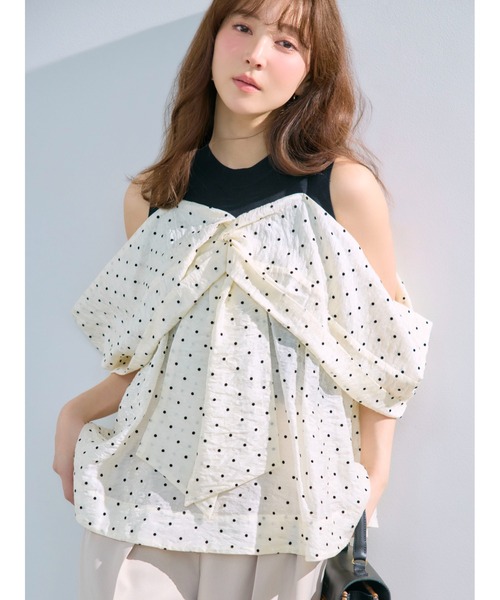 【エアリーなリボン風デザインが目を引くニットコンビトップス】【Design/Styling】総針編みのニットと、ポコポコとした表面感が魅力のシアー生地をドッキング。異素材のコントラストが洗練された存在感を放つ主役トップスです。大胆にあしらったリボンライクなツイストディテールも着映えをアシストし、1枚で華やかに。エアリーに広がるペプラムシルエットには体型カバー効果も。バックスタイルの華奢なベルトで胸下部分のフィット感の微調整を行うと、より素敵に着こなせます。カラーは全3色。優しいバイカラーで柔らかな印象に整えたWHT、肌の色を綺麗に補正してくれるLBLU、花柄のジャガード生地にドットプリントを施したモードで遊び心のあるDOTをご用意しました。※照明の関係により、実際よりも色味が違って見える場合があります。またパソコン・スマートフォンなどの環境により、若干製品と画像のカラーが異なる場合もございます。予めご了承ください。商品の色味は、商品単品画像をご参照下さい。 ※商品画像はサンプルのため、色味やサイズ等の仕様に変更がある場合がございますので、予めご了承ください。