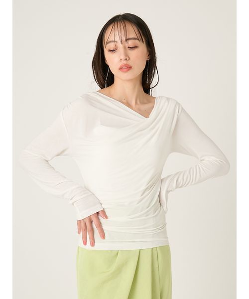 【オフショルとしても使える優美なタックドレープトップス】【Design/Styling】構築的なタックから生まれる流れるようなドレープが美しいカットソー。アシンメトリーなデザインがシンプルながらもモードな存在感を発揮します。程よい開き具合いのネックラインはオフショルとしても使える2WAYで、センシュアルなムードをプラス。胸元はパカパカと浮いたりしないバランスに調整し、安心感のある着心地を叶えました。素材にはしなやかさとフィット感を兼ね備えたレーヨン混フライスを使用。体のラインを拾いすぎず柔らかなフィット感です。袖はやや長く設定して手元にニュアンスを加えました。デニムなどベーシックなボトムに合わせるだけでもサマになり、シーンレスで活躍します。色展開は、WHT、PNK、LBLU、TUQの充実したラインナップ。※照明の関係により、実際よりも色味が違って見える場合があります。またパソコン・スマートフォンなどの環境により、若干製品と画像のカラーが異なる場合もございます。予めご了承ください。商品の色味は、商品単品画像をご参照下さい。 ※商品画像はサンプルのため、色味やサイズ等の仕様に変更がある場合がございますので、予めご了承ください。※配送時の状況により、箱が破損している場合がございますので予めご了承下さい。