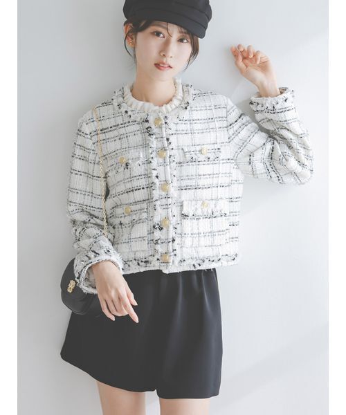 【フリンジディテールが華やか!取り外し可能なシフォン襟付きのツイードジャケット】【Design/Styling】太さや質感の異なる糸が重なり合い、スタイリングに洗練された印象をプラスします。軽く柔らかい生地感なのでカーディガンのように羽織れるのが特徴です。コンパクトなサイズ感でお作りしており、着膨れしにくいシルエットも魅力。着丈はやや短め設定で、ボリューム感のあるボトムと合わせると今季らしいバランスを叶えます。襟ぐり・袖口・ポケット口・裾などには共生地のフリンジディティールをあしらい華やかな仕上がりに。襟ぐりには柔らかなシフォン生地の付け外し可能なフリルパーツをあしらいました。スタイリングに合わせて調節いただけます。前立てやポケットにあしらわれたエレガントなボタンがポイントに。胸ポケットのみイミテーションディティール。全体に裏地付き。同色・同素材で丈の長さを変えたタイプのロングツイードジャケット(SWFJ261254)もご用意がございます。【Fabric】タイムレスに着まわしやすい白黒チェック柄のホワイト、ブルーとレッドの糸を織り込みどこかマリンテイストを感じさせるピンクの華やかなチェックの2色展開。シフォン生地のフリルの色味は2色ともにホワイト。透け感;なし裏地;あり伸縮性;なし光沢感;ややあり生地の厚さ;普通【おすすめ骨格タイプ】■骨格ウェーブ※照明の関係により、実際よりも色味が違って見える場合があります。またパソコン・スマートフォンなどの環境により、若干製品と画像のカラーが異なる場合もございます。予めご了承ください。商品の色味は、商品単品画像をご参照下さい。 ※商品画像はサンプルのため、色味やサイズ等の仕様に変更がある場合がございますので、予めご了承ください。