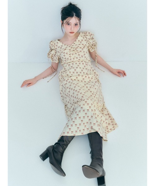 【ヴィンテージライクな雰囲気で仕上げたリボンプリントワンピース】【Design/Styling】ミニリボンデザインのプリントを散りばめ、ヴィンテージライクな雰囲気で仕上げたリボンモチーフワンピースが届きました。小ぶり過ぎず大き過ぎないリボンモチーフを華やかな配色でプリントしています。モチーフひとつひとつは、繊細なタッチで仕上げ、ポップすぎない大人な印象に。大人気のパフスリーブOPに袖に長めの細りぼんを垂らすことで今らしくアップデートしました。程よいパフスリーブでしっかり腕周りをカバーしながらも、デコルテ見せで女性らしい抜け感をプラスしています。ウエスト高め位置で切り替えを入れているので、美脚効果も抜群です。同色でお作りしたリボンドッキングカーディガン(SWNT261065)とのセットコーデもおすすめです。【Fabric】自然な落ち感が魅力的な、皺になりにくく軽やかなポリエステル素材を使用。旅先やデイリー使いにも便利です。さらりとした肌触りで着心地の良い1枚です。ベージュ(リボンの色がレッド)ライトブルー(リボンの色がネイビー)、ネイビー(リボンの色がレッドやピンクやホワイト)の3色展開です。透け感;なし裏地;なし伸縮性;なし光沢感;なし生地の厚さ;やや厚手※照明の関係により、実際よりも色味が違って見える場合があります。またパソコン・スマートフォンなどの環境により、若干製品と画像のカラーが異なる場合もございます。予めご了承ください。商品の色味は、商品単品画像をご参照下さい。 ※商品画像はサンプルのため、色味やサイズ等の仕様に変更がある場合がございますので、予めご了承ください。