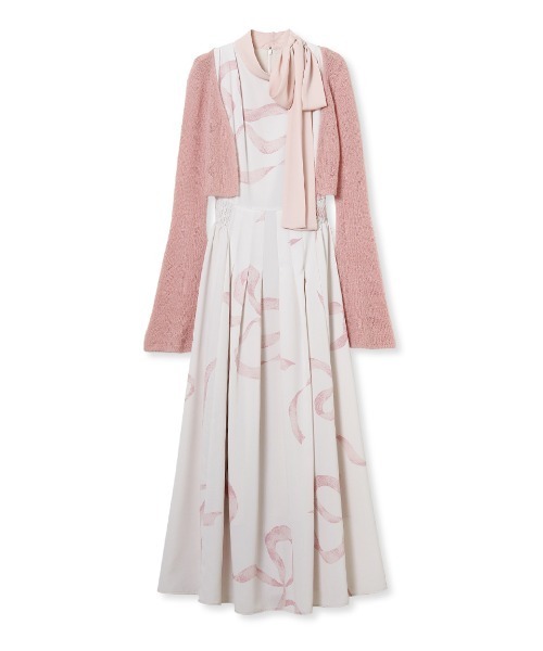 【上品エレガントなリボンプリントをあしらったボウタイワンピースとニットカーディガンのセット】【Design/Styling】抽象的な筆タッチの大柄リボンプリントと、しなやかに揺れるシルエットがエレガントなボウタイワンピースに、合わせのカーディガンがセットになって登場!ノースリーブワンピースは、ハイウエスト位置で切り替えを入れ、スカート部分はタックを入れて裾にかけて優しく広がるAラインで仕上げています。サイドにはゴムシャーリングを入れてフィット感を出し、背中側の細リボンでシルエットを調節いただけます。ワンピースの素材はとろみ感のある、軽く柔らかな生地です。首元には配色で長めのボウタイリボンを施し、クラシカルな雰囲気に。後ろ首元のカラーの2つのボタンと背中側ファスナーで着脱いただけます。少し短めのワンピースに合わせやすい丈感でお作りした、ふんわりローゲージ編みのニットカーディガンもセットで便利です。カーディガンのフロントはボタンなしで仕上げた軽やかに羽織れるデザイン。まだ寒さの残る時期に、温かさをプラスします。【Fabric】オフホワイト(ホワイトのカーディガンがセット)、深みのあるブラウン(ホワイトのカーディガンがセット)、ライトブルー(ライトブルーのカーディガンがセット)、WEB限定カラーでピンク(パウダリーなピンクのカーディガンがセット)が登場します。オフホワイトはブラックのボウタイリボンで配色に。ブラウンはホワイトのボウタイリボンで配色に。ライトブルーはグレーのボウタイリボンで配色に。ピンクはピンクのボウタイリボンで仕上げています。透け感;なし裏地;あり伸縮性;なし光沢感;なし生地の厚さ;普通【おすすめ骨格タイプ】■骨格ウェーブ■骨格ナチュラル※照明の関係により、実際よりも色味が違って見える場合があります。またパソコン・スマートフォンなどの環境により、若干製品と画像のカラーが異なる場合もございます。予めご了承ください。商品の色味は、商品単品