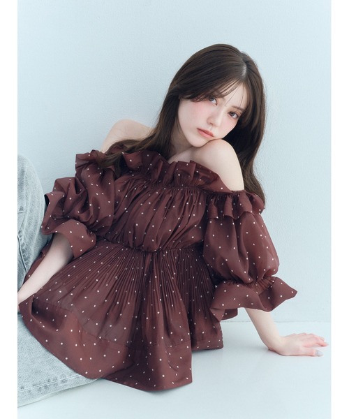 【人気のギャザーオフショルブラウスを今季はチュニック丈でお作りしました】【Design/Styling】少し透け感のある、ふんわり艶やかなシフォン生地でお作りしたオフショルで着られるボリュームギャザーフリルチュニックが届きました。SNIDEL人気のデザインで、今季はやや着丈を長めにデザインしています。胸下位置にゴムを入れてメリハリを出したペプラムシルエットで、気になるお腹やお尻周りをカバーし、華奢見えと美シルエットを叶えます。着心地の良さも抜群です。細身のボトムスはもちろん、ワイドパンツとも相性抜群の1着です。細やかなランダムプリーツを胸元の豪華なフリルやペプラム部分に入れてエレガントな印象に。袖口にもゴムを入れフィット感を出しながらふんわりと仕上げました。動くたびにふわりと軽やかにフリルや裾のペプラムが揺れて華やかな印象です。被りでご着用いただけます。【Fabric】ピュアな印象のホワイト、まろやかで優しい色味のオレンジ、ブラウンの生地にホワイトのドットのドット、着回し力抜群なブラックの4色展開です。裏地付き。透け感;なし裏地;あり伸縮性;ややあり光沢感;なし生地の厚さ;普通【おすすめ骨格タイプ】■骨格ウェーブ■骨格ナチュラル※照明の関係により、実際よりも色味が違って見える場合があります。またパソコン・スマートフォンなどの環境により、若干製品と画像のカラーが異なる場合もございます。予めご了承ください。商品の色味は、商品単品画像をご参照下さい。 ※商品画像はサンプルのため、色味やサイズ等の仕様に変更がある場合がございますので、予めご了承ください。
