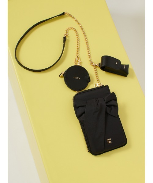 【マルチに使える人気のリボンショルダーが登場!】【Design/Styling】最低限の荷物が全て入る人気のマルチショルダーが登場。フロントのビッグリボンデザインが愛らしいアイテムです。ふんわりパフィーな素材でお作りしたスマホ&お財布ポーチや、イヤホンなどが入るフェイクレザーの丸型ポーチとリップなどが入るケースがセットになったミニショルダーです。それぞれにSNIDELロゴを添えました。本体ポーチの内側はカード類やコインが入れられるお財布仕様。外側のポケットにはスマートフォンが入れられます。L字ファスナーで取り出しやすく仕上げました。丸型ポーチとリップケースは取り外しが可能です。ホワイト、ブラック、イエローの3色展開に、WEB限定カラーのライトピンクが加わった4色展開。チェーンの色味はゴールドです。アクセサリー感覚でコーディネートのアクセントに取り入れられるアイテムです。※照明の関係により、実際よりも色味が違って見える場合があります。またパソコン・スマートフォンなどの環境により、若干製品と画像のカラーが異なる場合もございます。予めご了承ください。商品の色味は、商品単品画像をご参照下さい。 ※商品画像はサンプルのため、色味やサイズ等の仕様に変更がある場合がございますので、予めご了承ください。