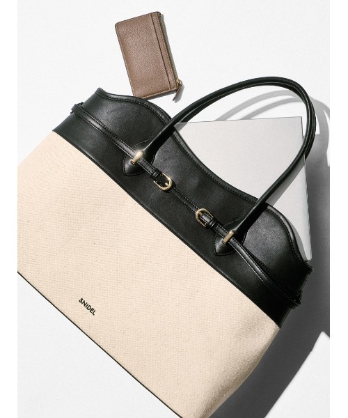 【機能性を兼ね備えた、A4サイズが入る大人気のソフトベルトトートバッグ】【Design/Styling】昨年も大人気だったソフトベルトトートバッグのリバイバルがお目見え。細ベルトとゴールドバックルが、クラシカルでエレガントなアイテムです。ベルト部分にはSNIDELロゴを刻印しました。A4サイズもしっかり入るトートサイズなので、お出かけやお仕事シーンでも大活躍。ブラックはトレンドライクなヴィンテージ調のシボ感のあるフェイクレザー、WEB限定カラーのベージュはクリーンで艶感のあるフェイクレザーでお作りしています。今回は、スエード調素材のコーヒーカラーのブラウンと、キャンパス生地とブラック合皮を組み合わせたミックスを加えた4色展開でご用意しました。ミックスのみSNIDELロゴはボディにブラック刺繍で入れています。開口部はマグネット使用で中が見えにくく、内側にはカード類などが入れられるファスナー付きのポケットが付いています。シンプルなデザインなので、フラワーブルームチャーム(SWGG261679 )や、クロシェチャーム(SWGG261618)などのバッグチャームアレンジにもぴったりのアイテムです。※照明の関係により、実際よりも色味が違って見える場合があります。またパソコン・スマートフォンなどの環境により、若干製品と画像のカラーが異なる場合もございます。予めご了承ください。商品の色味は、商品単品画像をご参照下さい。 ※商品画像はサンプルのため、色味やサイズ等の仕様に変更がある場合がございますので、予めご了承ください。