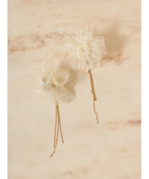 【SNIDELらしい華やかで優しげなフラワーモチーフを表現した、3種類の特別なピアス】【Design/Styling】SNIDELオリジナルでお作りした春夏気分が盛り上がるフラワーモチーフの3種類のピアスをご用意しました。存在感のあるデザインで、デニムスタイルにも、パーティードレスにもぴったりな華やかなアイテムです。 A: ふんわりと重なり、広がるクチュールライクな花びらが耳元で動くたびに揺れる、フラワーピアスです。透明感のある煌めきオーガンジー生地にシボ感を加えてロマンティックなヴィンテージ風に仕上げました。フラワーの下側には2本の繊細ゴールドチェーンをあしらい、ドラマティックに揺れるデザインに。顔周りが一気に華やぐアイテムです。 B:透け感と艶感のあるホワイトオーガンジー素材を使用し、ふんわりと空気をはらむ立体的なフラワーモチーフにアレンジしたピアスです。花芯の中央にはブラックビーズをあしらい、モードに仕上げました。軽量で着け心地の良いアイテムです。 C:華奢なメタルラインが抽象的なフラワーシルエットを描いたエレガントなピアスです。中央には、コロンとした大粒のフェイクパールビーズをあしらい、モードに仕上げました。大振りデザインですが軽量なのでストレスフリーな着け心地。スタイリングに遊び心をプラスしてくれるアイテムです。※照明の関係により、実際よりも色味が違って見える場合があります。またパソコン・スマートフォンなどの環境により、若干製品と画像のカラーが異なる場合もございます。予めご了承ください。商品の色味は、商品単品画像をご参照下さい。 ※商品画像はサンプルのため、色味やサイズ等の仕様に変更がある場合がございますので、予めご了承ください。