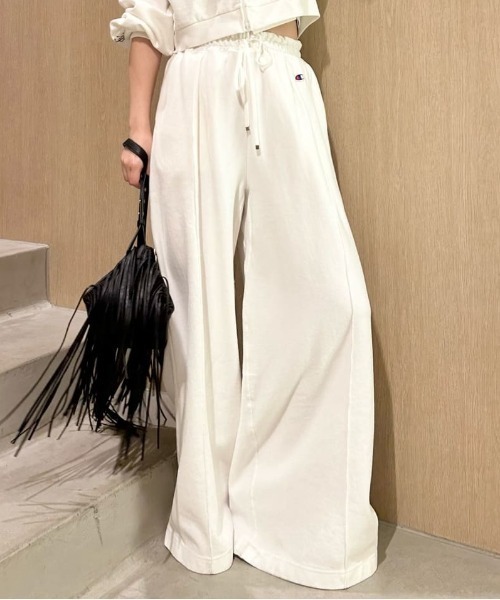 【【FRAY I.D|Champion】スウェットワイドパンツが大人のストリートムードを演出】【Design/Styling】Champion(チャンピオン)の歴史あるカジュアルテイストに、FRAY I.Dならではの女性らしいシルエットやディテールを取り入れたエクスクルーシブコレクション。大人の余裕漂うスウェットパンツは、ワイドストレートシルエットでストリートカジュアルな中に洗練されたムードを加えた一枚。ハイウエスト×センタープレス風のピンタックが脚長効果もアシストしてくれます。本来は縦方向に使われる生地を横方向に使用する「REVERSE WEAVE®」製法によって縦の生地の縮みを防ぐと同時に、股下部分にガゼットリブを付けることで動きやすさに配慮しています。後ろポケットにはFRAY I.Dのロゴをあしらい、さりげないポイントに。色展開は、OWHT, PNK, NVYの3色。同素材のオフショルスウェット(FWCT261806)や、ジップアップパーカ(FWCT261805)とのセットアップ着用がおすすめです。その他、同コレクションにスカート(FWCS261808)のご用意も。※照明の関係により、実際よりも色味が違って見える場合があります。またパソコン・スマートフォンなどの環境により、若干製品と画像のカラーが異なる場合もございます。予めご了承ください。商品の色味は、商品単品画像をご参照下さい。 ※商品画像はサンプルのため、色味やサイズ等の仕様に変更がある場合がございますので、予めご了承ください。