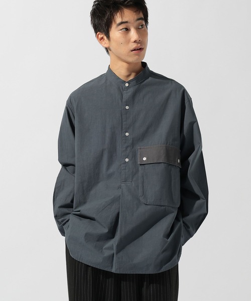 ワンランク上の「大人の装い」 ユーズドライクな風合いが癖になるワークシャツ -Design- ビンテージのシャツをベースにした、ディテールにこだわり抜いたプルオーバー。 大きめのマチ付きポケットには、別生地を使用したフラップをあしらいワンポイントに。 裾は前部分をラウンド、後ろはスクエアデザインにし、大きめのスリットを入れて抜け感のあるデザインに仕上げました。 -Fabric- 古着のようなマットで洗いざらしの質感がある、綿100%のポプリン生地を使用。 程よくハリがあり、軽やかでさらっとした着心地です。 -Silhouette- 肩幅と身幅にゆとりを持たせたリラックスシルエット。 -Styling- カーゴやベイカーパンツ、足元はローファーで引き締めたミリタリ―コーデ。 カジュアルならデニムやチノパン、足元はスニーカーで軽やかにまとめるのがおすすめです。 ▽おすすめの合わせアイテム▽ 品名:リジットワイドデニムパンツ 品番:641470 ※屋外の光や照明の当たり具合で、実際の商品の色味とカラー別画像の色味に違いが発生する場合がございます。商品の色味はスタジオ撮影の詳細画像にてご確認ください。 ※商品の色や質感を出来るだけ忠実に再現するよう心掛けていますが、実物と若干異なる場合がございます。 ※取扱いアイテムは店舗により異なる場合がございます。