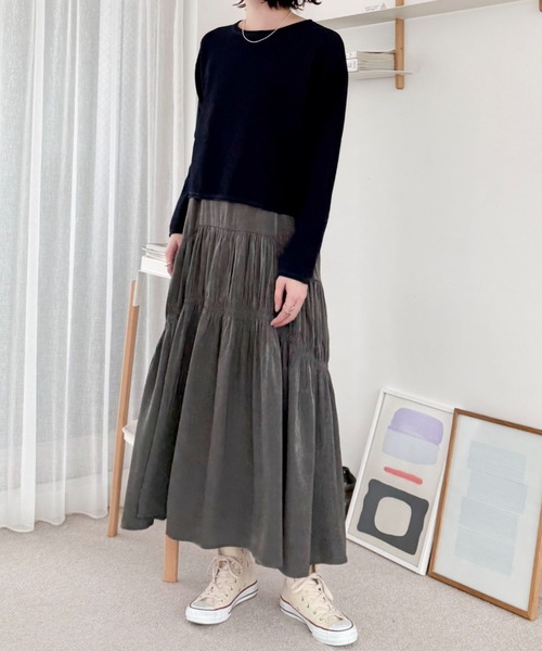 着回し力抜群のワンピース 【point】 ・ニットプルオーバーとキャミワンピースがセットになったアイテム ・キャミワンピースはアジャスターで肩ひもの長さ調節が可能 ・ティアード切り替えが裾にかけてボリュームを出し、一枚でも着映えします ・ニットはやや短めの着丈とゆったりとしたサイズ感がトレンドライクなデザイン ・それぞれ別使いが出来るので、春から秋まで長く着ていただけます 【fabric】 ・キャミワンピースはやや光沢のあるさらっとした素材 ・ニットはちくちく感のない滑らかな肌触り 透け感:なし 裏地:なし 伸縮性:ニットあり 光沢感:キャミワンピースあり 生地の厚さ:普通 【注意事項】 ・画像の商品はサンプルです。 実際の商品と仕様、加工が若干異なる場合があります。 ・サイズ表記はあくまで目安となります。 ・取り扱いについては、商品についている品質表示でご確認ください。 ・照明の関係により、実際より明るく見える場合がございます。またパソコンなどの環境により、製品と画像のカラーが若干異なる場合がございますので、予めご了承くださいませ。