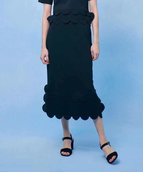 【LOULOU WILLOUGHBY 2026 Spring & Summer】 ※LOULOU WILLOUGHBY店舗とオンラインショップ限定販売になります。 トレンドのニット×レースディテールを、ルルらしく上品に取り入れたタイトスカート。 裾のスカラップ部分にはレース柄をパンチングで表現し、繊細で華やかな印象に仕上げました。 柄は一から起こしたオリジナルで、他にはない特別感も魅力です。太リブとの切り替えが、スカラップのラインをより美しく引き立てます。 コンパクトなシルエットながら、裾脇にスカラップ3枚分のスリットを入れることで足さばきも良く、歩くたびに軽やかで女性らしい表情を演出。きれいめにもフェミニンにも着回しやすい一着です。 同素材のトップス(品番:21261016220)とのセットアップコーデもお勧めです。 ※照明の関係により、実際よりも色味が違って見える場合がございます。 またパソコン・スマートフォンなどの環境により、製品と画像のカラーが異なる場合もございます。 予めご了承ください。
