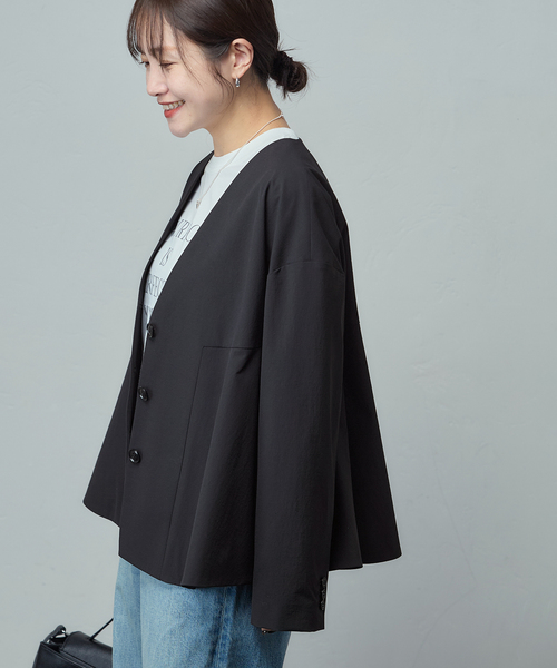 JOURNAL STANDARDジャーナルの定番素材リネンナイロンストレッチで、新型のジャケットが登場。ナイロンストレッチ素材にリネンをブレンドしてナチュラルな表情を出したジャーナルのオリジナル素材。ストレッチ性と撥水性、イージケア性などの機能を備えています。サッと羽織って着映えするフレア型のノーカラージャケット。同素材のパンツのご用意もあるので、セットアップで着こなすことも。**********************透け感:なし裏地:あり伸縮性:ややあり光沢感:なし生地の厚さ:普通**********************【スタッフ着用コメント】《スタッフO》年齢:30代前半/身長:158cm/体型:普通/普段サイズ:M/着用サイズ:フリーサイズ感:ややゆとりのある程よいサイズ感。素材感:軽くて着やすいです。サラリとした素材。着心地:シンプルかつ様になるジャケット。使いやすく、楽な着心地。※あくまでも個人の感想です。**********************※取り扱いについては、商品についている取扱表示にてご確認下さい。※照明の関係により、実際よりも色味が違って見える場合があります。またパソコン・スマートフォンなどの環境により、若干製品と画像のカラーが異なる場合もございます。※商品の色味は、商品アップ画像をご参照ください。本体:手洗い可能