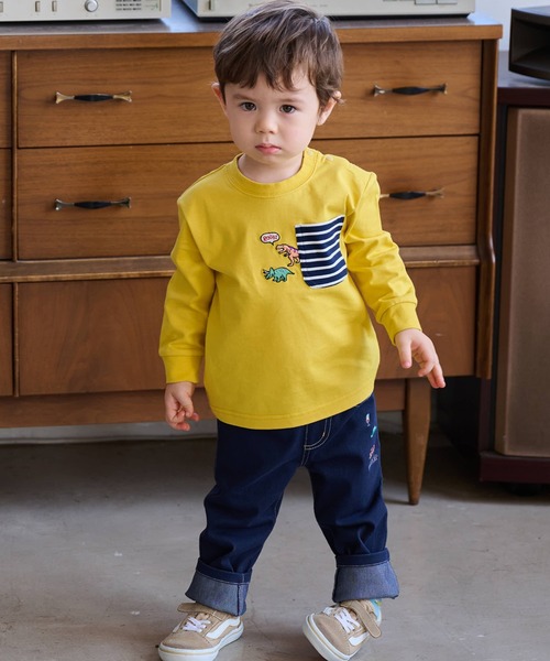 愛らしい恐竜を刺しゅうした長袖Tシャツです。 胸ポケットから飛び出しているような、個性あふれるデザイン。 肌触りの良いコットン100%生地なので、快適な着心地です。 デニムパンツやスニーカーなど、カジュアルなアイテム合わせがおすすめ。 内側にお名前を記入できるタグがついています。 ※こちらは2026年福袋の単品販売商品となります。 【透け感】透けない 【生地の厚さ】普通 【伸縮性】あり 【裏地】なし