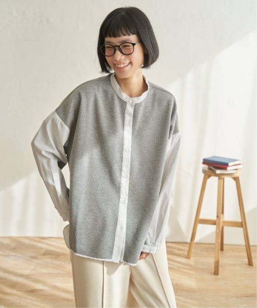 ツイード/ワッフル素材とシャツ生地を組み合わせた、異素材切り替えデザインのシャツ。オーバーサイズのバンドカラー仕様で、春らしい軽やかな着こなしが楽しめます。一枚着としてはもちろん、羽織りとしても使いやすいアイテム。【素材】ツイード/ワッフルとシャツの異素材切り替え。【デザイン】オーバーサイズバンドカラーシャツ。【ポイント】春らしいツイード/ワッフルとシャツ生地の切り替えで、一枚でサマになる便利シャツです。人気のワッフル切り替えは、ストライプ柄と切り替えた新色を追加しました。