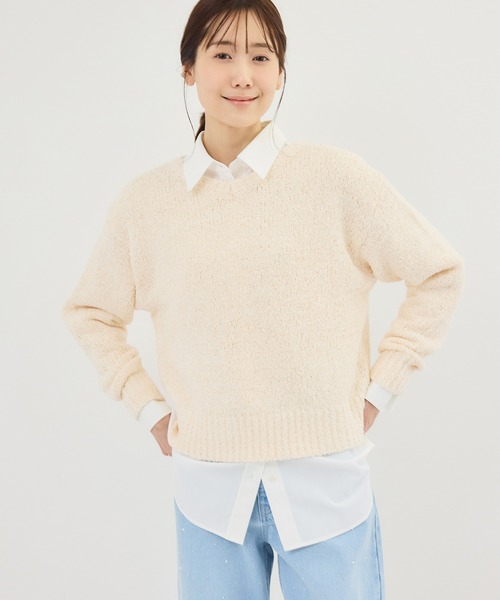 【素材感】・片畦編みの立体感に、動きのあるフリンジヤーンを掛け合わせた表情豊かなニット。・さりげなくラメ糸を織り交ぜ、動くたびに上品なきらめきを演出。・存在感がありながら、日常使いしやすい素材感。【デザイン・シルエット】・浅めのVネックで、デコルテをすっきりときれいに見せるデザイン。・一枚で着映えしつつ、華やかさを程よく抑えた大人バランス。・レイヤードにも使いやすい、抜け感のあるシルエット。【カラー】・ベーシックで着回しやすいアイボリー。・スタイリングのポイントになるブルー。・春らしく柔らかな印象のラベンダーとイエロー。・全4色展開。※キナリ(16):ゴールドラメ糸※ブルー系(45):シルバーラメ糸※ラベンダー(52):シルバーラメ糸※クリーム(83):ゴールドラメ糸【スタイリングポイント】・シャツとのレイヤードで、フリンジヤーンの表情を引き立てた今年らしいスタイルに。・一枚着としてはもちろん、インナーにカットソーを重ねた軽やかな着こなしもおすすめ。----------------------------- 裏地:なし 光沢感:なし(ラメあり) 透け感:なし 伸縮性:あり 生地の厚さ:やや厚手 季節:春、秋、冬 -----------------------------※撮影時の光、お使いのモニター環境によって色の見え方が違う場合がございます。※2025年秋冬商品より、ワンサイズ展開の商品は「F(フリーサイズ)」表記に変更しております。詳しい採寸はサイズ欄をご覧ください。【モデル着用サイズ】身長:165cm 着用サイズ:F【2026 Spring】【26SS】