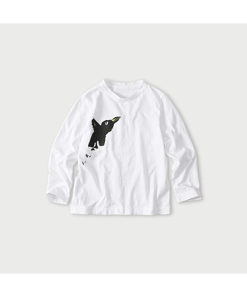 コンパクトな女の子Tシャツ製品に知恵と工夫をこらして、生まれ変わった「再び」シリーズ。カラスのペーペー君を油絵のようなベタッチプリントで描きました。オーストラリアの大自然に囲まれて、ゆっくりと育ったコットンはしっとり、なめらかで上品な肌触りです。少し太めのムラ糸を紡いで天竺を編み立てると、軽やかなタッチで肌にあたり着れば着るほど風合いが増していくような気持ち良いTシャツです。着丈短め、四角いコンパクトなシルエット。サイズ感をお選びいただける女の子のTシャツです。