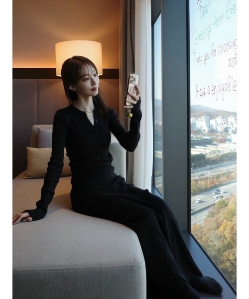 ・amel【RE ARRIVAL】再販アイテム【デザイン&ディテールポイント】ボディラインにほどよく添う、華奢なリブ編みのロングニットドレス。Iラインシルエットを強調し、スタイルアップ効果の高い一枚です。ヘンリーネックのボタンデザインがシンプルな中にさりげないアクセントとなり、カジュアルすぎない大人フェミニンな印象を演出。袖口は少し長めで、くしゅっとしたシルエットが女性らしさをプラス。裾に向かって広がるフレアラインも着映えするポイントです。グレーとブラックの二色展開。【コーディネートポイント】ブラックブーツと合わせるだけで、モードなオールブラックコーデが完成。ゴールドアクセやチェーンバッグをポイントにすると、上品で大人な華やかさが加わります。アウターはロングコートを合わせてIラインを強調すれば、よりスタイルアップした印象に。デイリーにも特別な日にも活躍するアイテムです。-----------------【Fabric】厚み:普通伸縮性:若干肌触り:普通裏地:なし透け感:なし-----------------