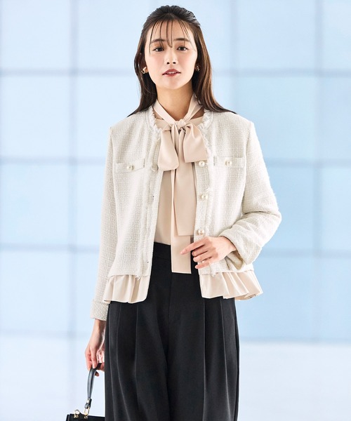 ノーカラー ツイード フリル ワイドパンツ スーツ | セレモニースーツ・ママスーツ・パンツスーツ・セットアップ・オケージョンスーツ・フォーマルスーツ・ノーカラージャケット