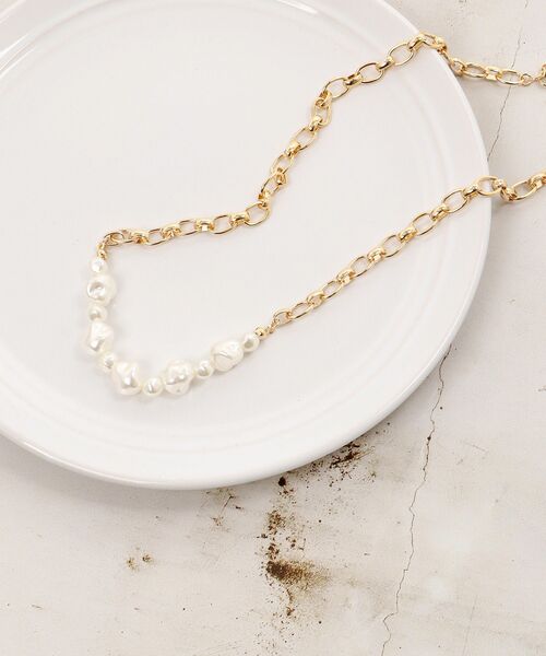 デザインパールとゴールドのチェーンを組み合わせた、ほどよくエッジの効いたネックレス。異素材のコントラストが首元に立体感を生み、シンプルな装いのアクセントになります◎日常的なデニムスタイルにも、華やかなお出かけシーンにもマッチするアイテムです。
