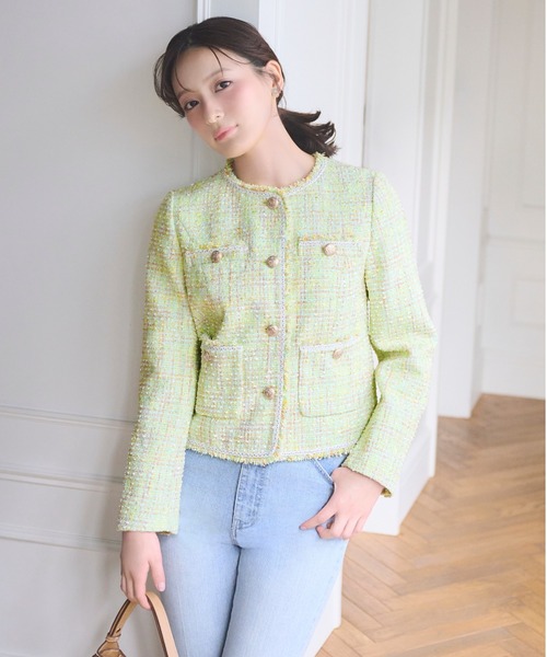 カラフルな糸を織り交ぜたミックスツイードで仕立てたジャケットは、クラシックな雰囲気にフリンジを効かせてほどよい抜け感をプラス。中にボウタイ付きブラウスを合わせれば、旬のレイヤードスタイルも手軽に楽しめます。 ベーシックなシルエットをベースにしつつ、前端や裾をラウンドに仕上げることで女性らしい柔らかさを演出。普段のコーディネートにも取り入れやすく、特別感と着やすさを両立した一枚です。 同素材のハーフスリーブツイードミニワンピース(CWFO261089)とのセットアップでの着用もオススメです。 【おすすめ骨格タイプ】 ■骨格ストレート ■骨格ナチュラル ※照明の関係により、実際よりも色味が違って見える場合があります。 またパソコン・スマートフォンなどの環境により、若干製品と画像のカラーが異なる場合もございます。予めご了承ください。 商品の色味は、商品単品画像をご参照下さい。 ※商品画像はサンプルのため、色味やサイズ等の仕様に変更がある場合がございますので、予めご了承ください。