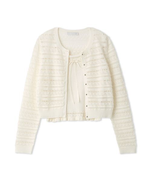 透かし編みのキャッチーなニットアンサンブル。さり気なく光沢感のある糸を使用しました。カーディガンはボーダー調に柄を組み合わせ、裾にピコ編みを入れました。インナーの身頃は透けないメッシュ編みで編み上げ、襟元にリボンを通すなど、さまざまなきゅんとするデザインポイントを加えた、それぞれ単品でも気映えするアイテムです。【おすすめ骨格タイプ】■骨格ストレート■骨格ウェーブ■骨格ナチュラル透け感:あり裏地:なし伸縮性:あり光沢感:あり生地の厚さ:薄手~中肉※照明の関係により、実際よりも色味が違って見える場合があります。またパソコン・スマートフォンなどの環境により、若干製品と画像のカラーが異なる場合もございます。予めご了承ください。商品の色味は、商品単品画像をご参照下さい。 ※商品画像はサンプルのため、色味やサイズ等の仕様に変更がある場合がございますので、予めご了承ください。