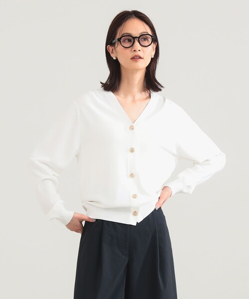 ■デザイン シンプルなVネックに、さりげなく輝くゴールドのメタルボタンが映えるカーディガン。ベーシックでありながら、羽織るだけで装いをクラスアップしてくれるデザインです。 ■コーディネート シャツやブラウスに重ねれば、知的なレイヤードスタイルが完成。ボタンを留めて、プルオーバー風に着用するのもおすすめです。 ■サイズ すっきりとした印象を保ちつつ、程良いゆとりをもたせたシルエット。 ■素材 極細のフィラメントのビスコース糸とナイロンを撚糸した糸を使用。きれいな表面感が特徴で、ロングシーズン活躍します。 ■ケア方法 手洗い可(詳細は商品についている洗濯表示タグをご覧ください。) Model:H171 B80 W58 H86 Size:ONE SIZE ********************** 生地の厚さ:普通 透け感:ややあり 伸縮性:あり 光沢感:ややあり 裏地:なし ********************** ※光の当たり具合やパソコンなどの閲覧環境によって、実際の色味と異なって見える場合がございます。予めご了承ください。 ※商品の色味は商品単体で撮影した画像をご参照ください。