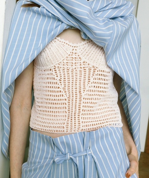 ◇26SS◇ADAM ET ROPE' EMOELLE【Material】かぎ針編みのハンドクラフトニット。リネン混の糸を使用し、適度なシャリ感とさらっとした質感が特徴。【Design】多数の透かし編みを組み合わせて編み立てたニットトップ。手編みならではのざっくり感とクラフト感が楽しめるアイテム。バランスの取りやすい短めな丈感で、編み柄の位置やバランスにこだわった1着。【Color】キナリの1色展開。【Styling Point】シャツやジャケットのインナーとしてアクセントにする着こなしがおすすめ。---------------透け感:あり裏地:なし伸縮性:ややあり光沢感:なし生地の厚さ:やや薄手---------------◇モデル情報詳細着用モデル:170cm size:Fその他のモデル着用サイズ:F※撮影時の光、お使いのモニター環境によって色の見え方が違う場合がございます。