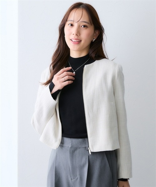■デザイン「ハレの日」も「日常」も。シーンを選ばない洗練されたシルエット。首元すっきりのノーカラーデザインが顔周りを明るく見せブラウスやフリルとのレイヤードが美しく映えます。ボタンではなくジップ仕様を採用することで、コンサバになりすぎず程よくトレンド感のある洗練された印象に仕上げています。実用的なポケットを備えつつ全体のシルエットを崩さないミニマルなデザインを追求しています。■素材<br>奥行きのある表情が魅力の上質ツイード。繊細な糸を丁寧に織り上げた、立体感のあるツイード生地を使用しており一目で上質さが伝わります。「ハレの日」にふさわしいなめらかなアイボリー系のカラーと杢グレーどちらも着用者の魅力を引き立てます。重厚感のある見た目ながら日常的に羽織りやすい軽やかさを兼ね備えています。■スタイリング一着で叶える、幅広いコーディネート。【Ceremony Style】 コサージュやパールを添え、プリーツスカートと合わせれば、入学式や結婚式など華やかな席にぴったりの品格ある装いに。【Business / Daily Style】 フロントのジップを活かし、パンツスタイルやデニムと合わせることで、大人の余裕を感じさせるきれいめカジュアルが完成します。【Mix & Match】 インナーにタートルネックを合わせたり、袖を軽く捲ったりと、合わせるアイテム次第で通年活躍する万能アイテムです。~働く服~nissenの通勤服専門ブランド。仕事の日、休日、イベントの日まで働く女性の毎日を商品やコンテンツを通し自分らしく快適でいられる“働く服改革”をサポートします。<洗濯方法>手洗い品質=【表地】ポリエステル100%【裏地】ポリエステル100%■キーワード7days、春、秋